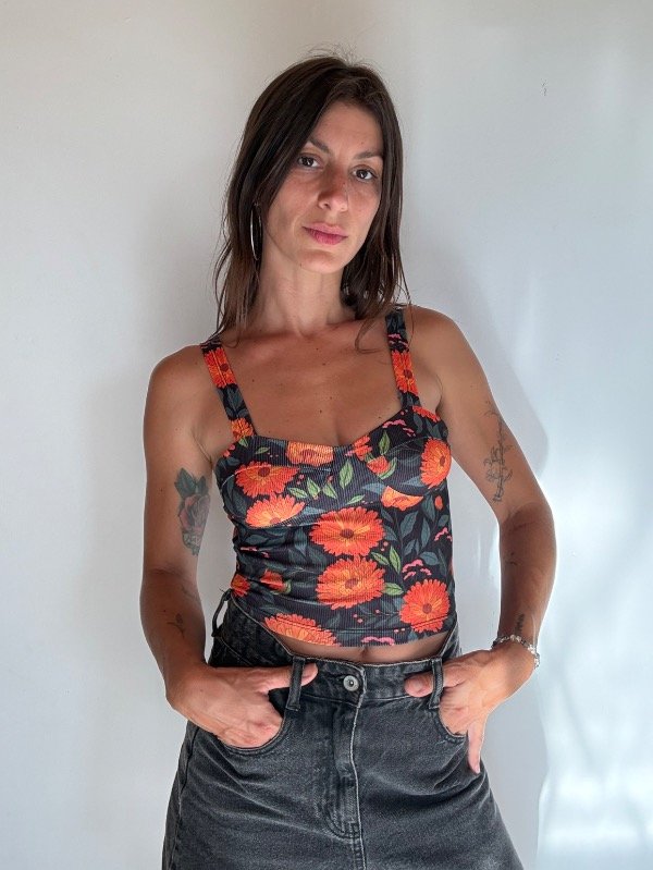Top tipo corset de Morley elastizado con lestampa Calendula ilustrada por Belen Santis para Mas Amor Interior.