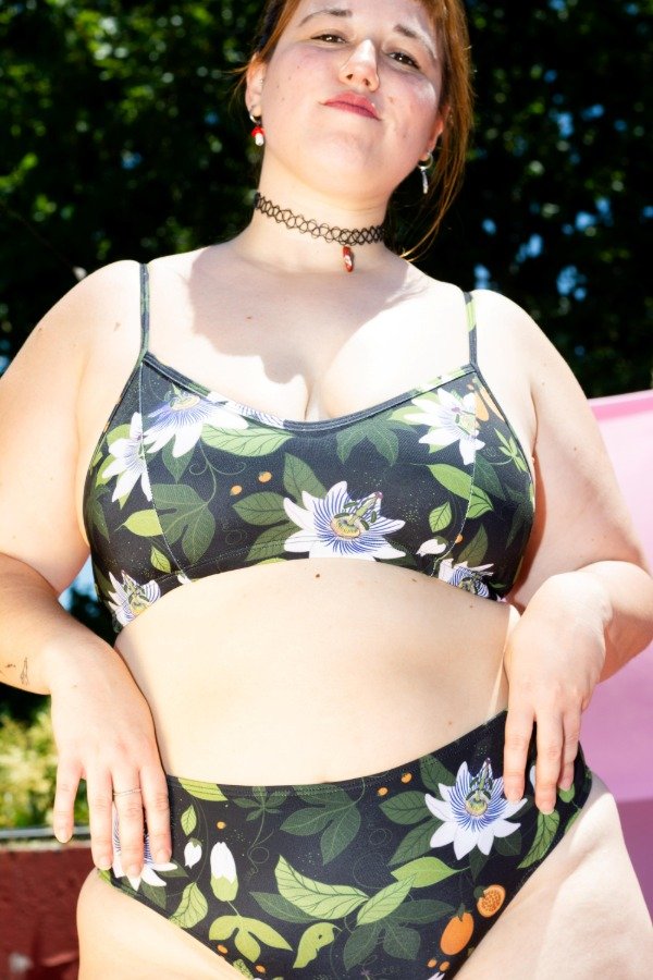 Corpiño Delfi de tricot con Lycra con estampa Pasionaria Noche ilustrada por Belen Santis para Mas Amor Interior.