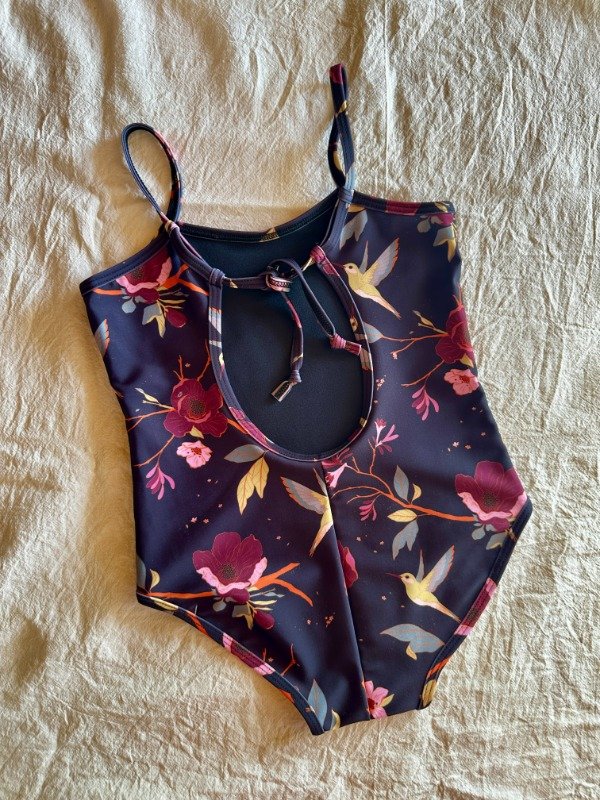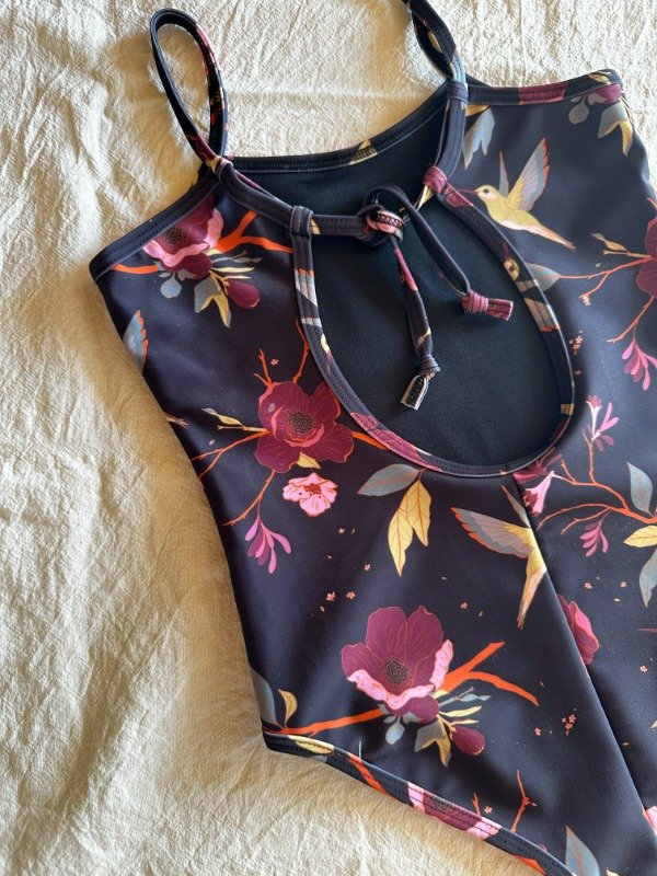 Mallita enteriza con tiras regulables de tricot con Lycra con estampa Aire ilustrada por Belen Santis para Mas Amor.