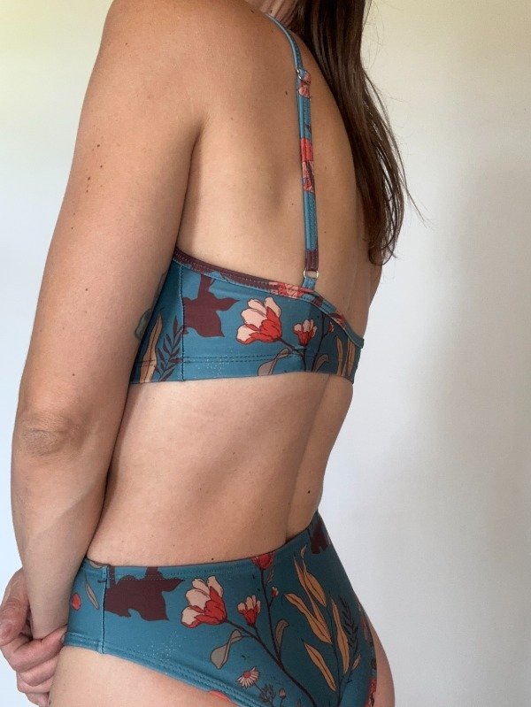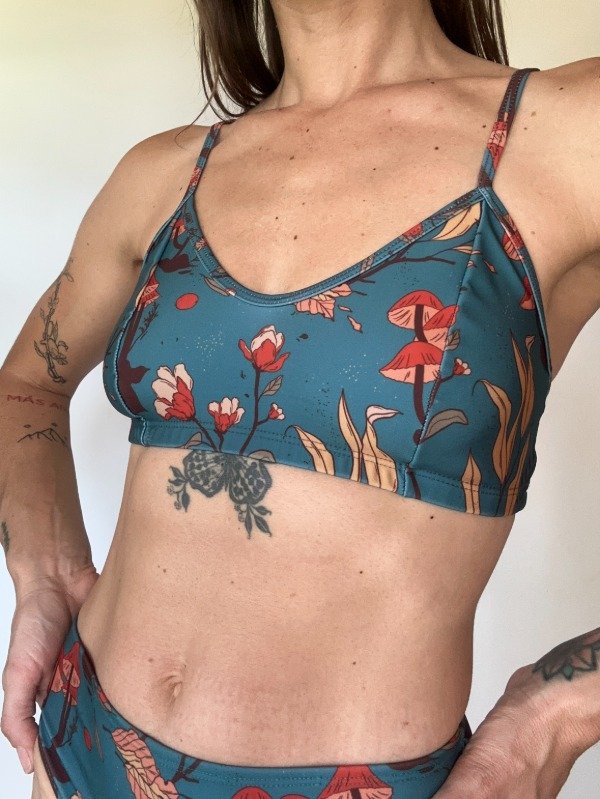 Corpiño Delfi de tricot con Lycra con estampa TIERRA ilustrada por Belen Santis para Mas Amor Interior.