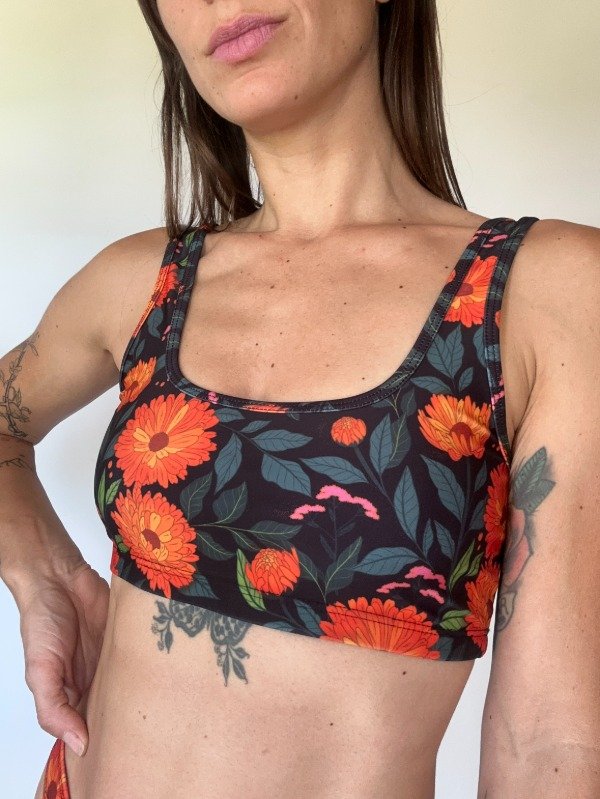 Top de tricot con lycra con proteccion UV, estampa CALENDULA ilustrada por Belen Santis para Mas Amor Interior.